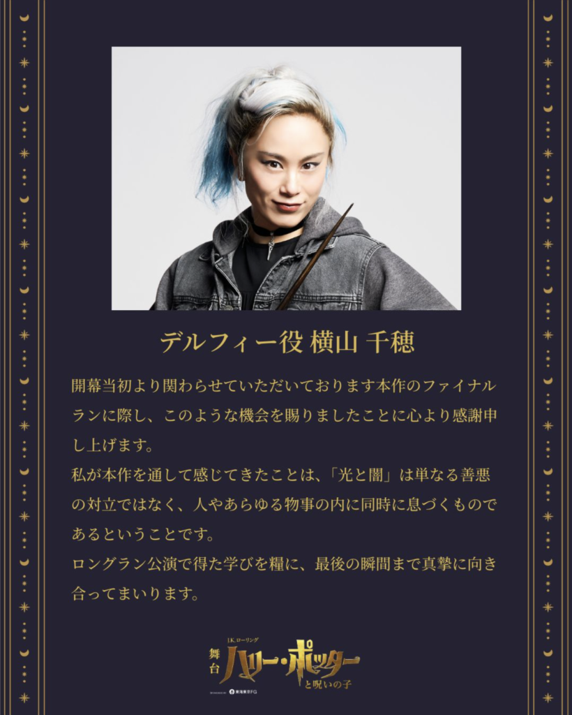 舞台『ハリー・ポッターと呪いの子』に横山千穂がデルフィー役で出演します。